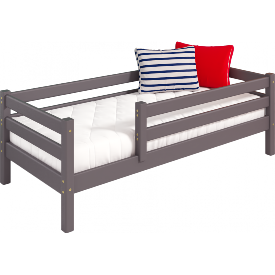 Кровать выполнена из массива дерева, может комплектоваться выкатными ящиками и аксессуарами из текстиля.