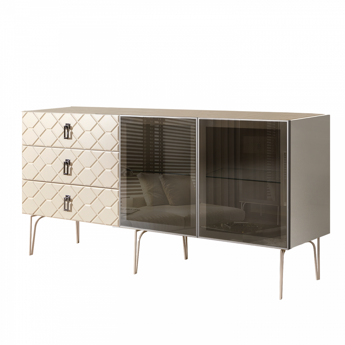 Стекло Stopsol меняет свои отражающие свойства под воздействием источников света. Поверхность, отражающая свет, мягко скроет содержимое вашего комода или витрины.