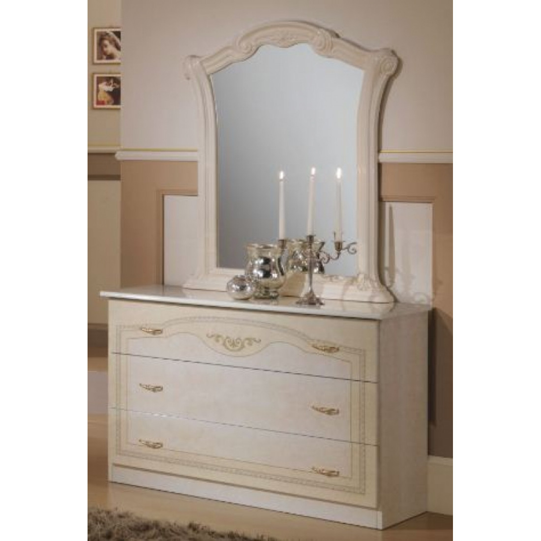Комод с зеркалом Ирина (беж) от Российской фабрики «ДИА мебель» выполнен в бежевом цвете в сочетании с глянцевым покрытием. Имеет три вместительные, открывающиеся полки. Такой многофункциональный комод поможет Вам с экономить место в спальне. Большое зеркало поможет визуально расширить комнату. Коллекция "Ирина" предназначена для настоящих ценителей классического стиля.