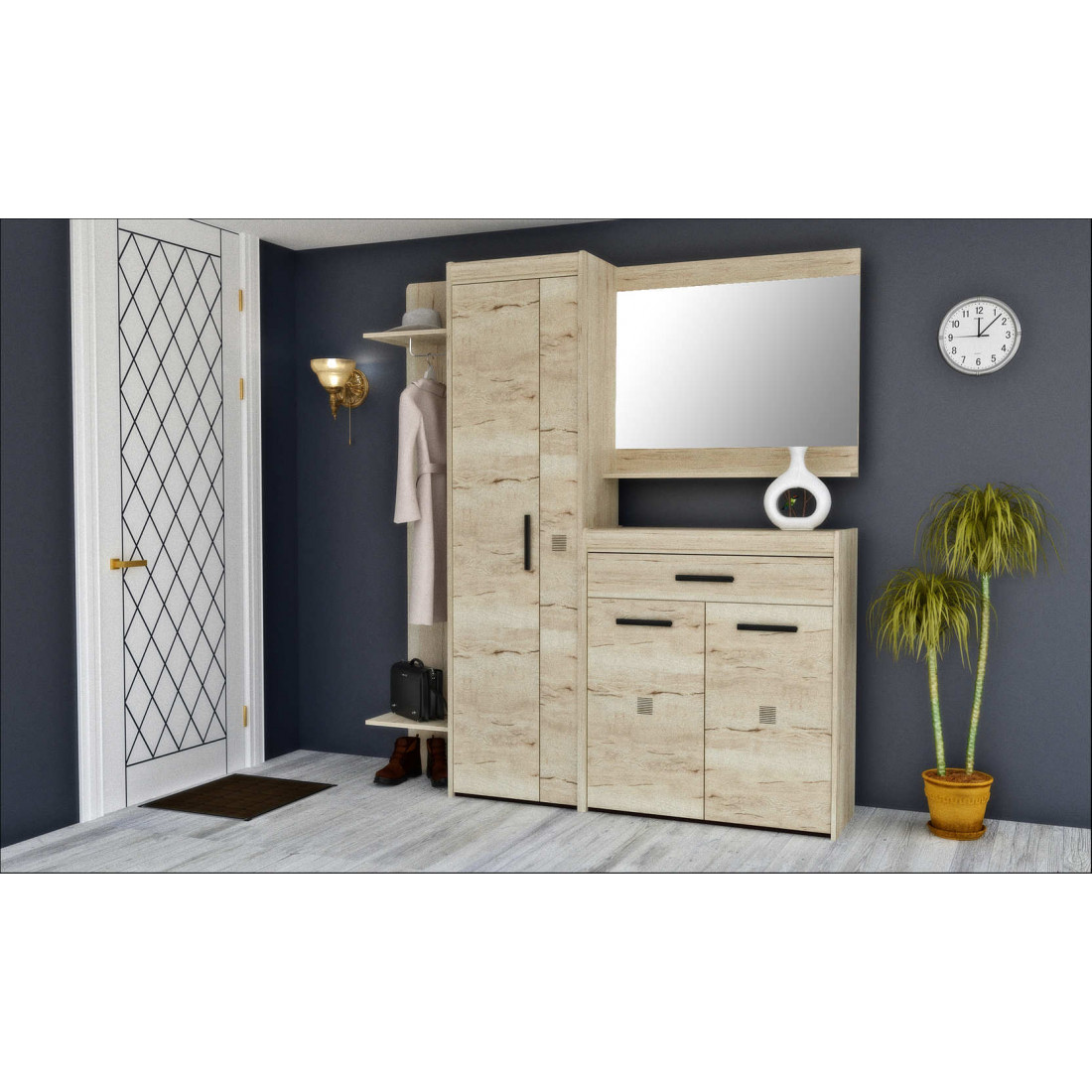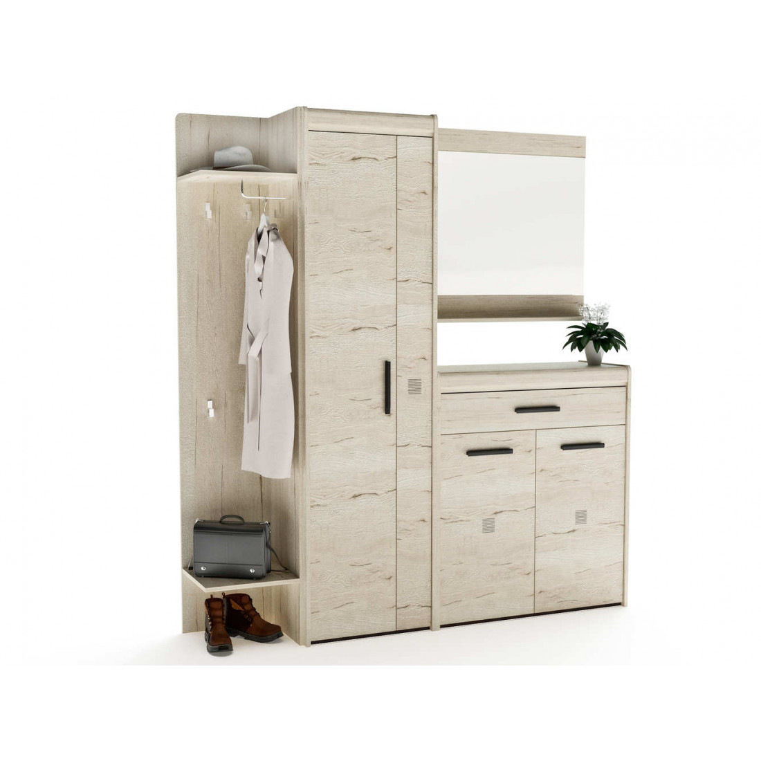 Прихожая «Мале» - обладательница лаконичного и свежего дизайна. Особое внимание привлекают тактильные ощущения от прикосновения к мебели. Декор и структуры, схожие с натуральным деревом по рисунку и шероховатости, придают глубину и естественность. Широкий спектр модулей позволит эргономично использовать Ваше пространство.